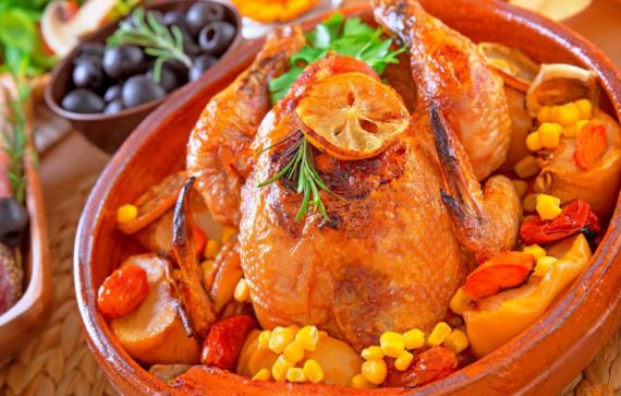 2、一整只雞保留完整,往雞肚子里塞上各種調(diào)理和拌好的食品;