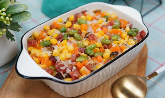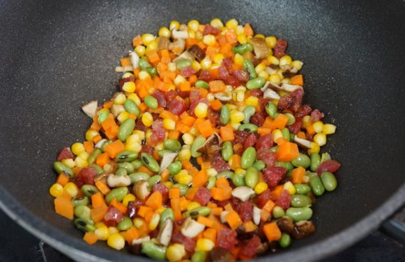 第五步:臘腸炒出油脂后加入胡蘿卜、玉米粒、青豆、香菇翻炒兩分鐘,最后加入1勺鹽、1勺雞精盛出備用。