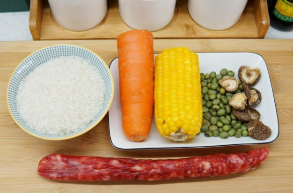 所需食材:臘腸1根,大米一小碗,青豆一把,胡蘿卜半根,玉米半根,干香菇一小把,鹽1勺,雞精適量。