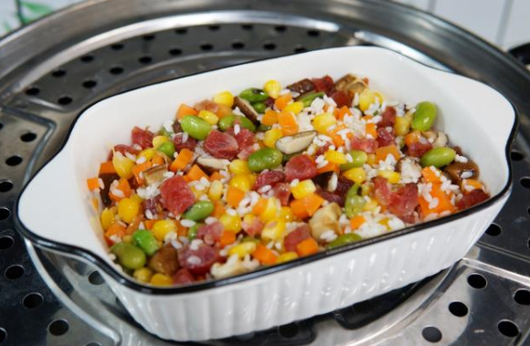 第六步:在大米中加入剛炒好的配菜,一起攪拌均勻,在蒸鍋里蒸25分鐘即可。這樣一碗噴香的立夏飯就做好了。