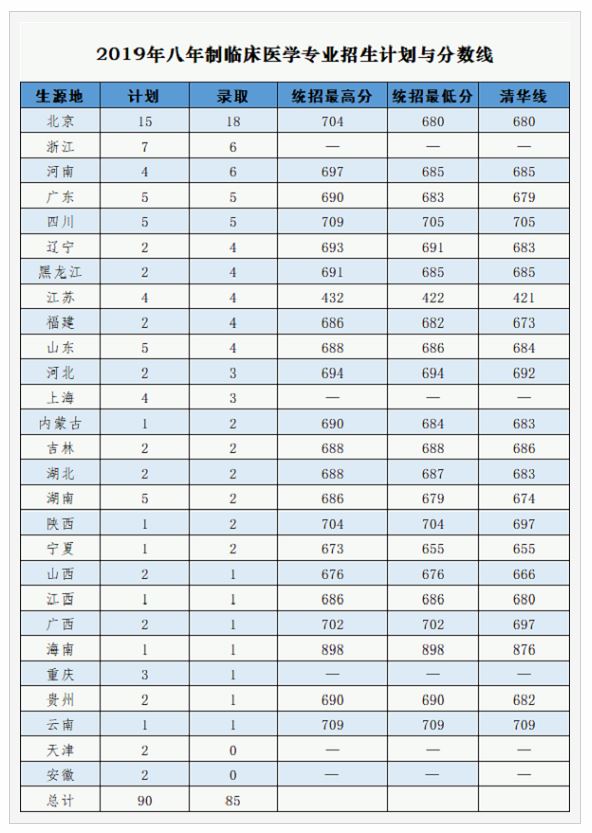 2019年北京協和醫學院八年制臨床醫學專業高考招生計劃90名,根據教育部的政策取消了二次招生。實際高招錄取85名,其中有全省排名前10的考生5名、全國生物和化學競賽金牌保送生5名。